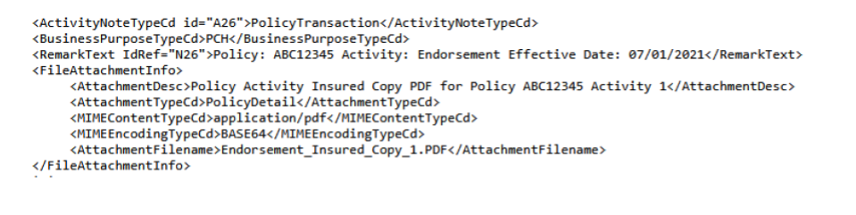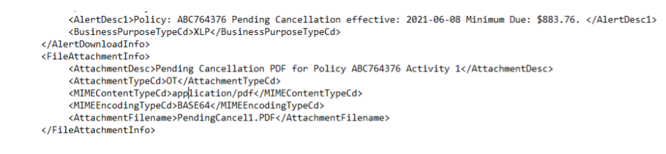 These documents are typically delivered through ACORD eDocs and Messages Standards and received via platforms such as IVANS and API integrations, often in base64-encoded format within the XML structure.